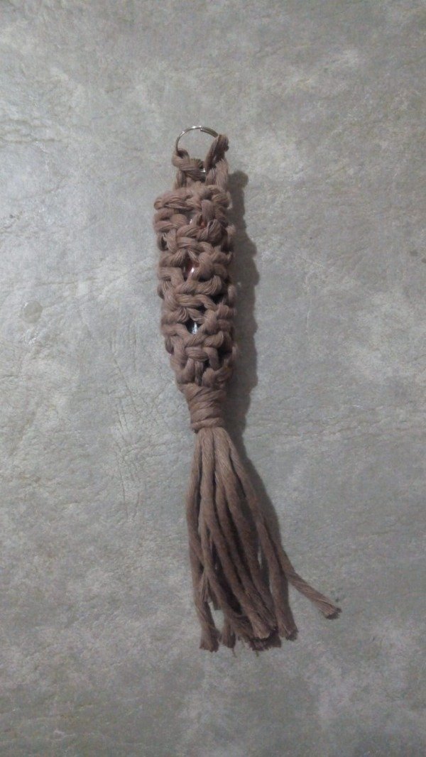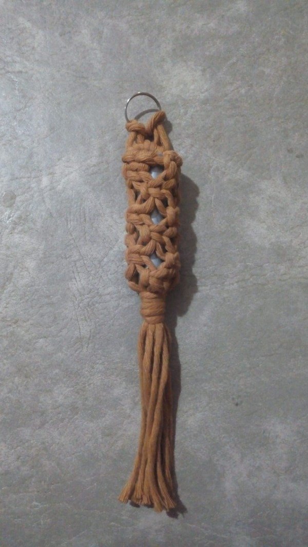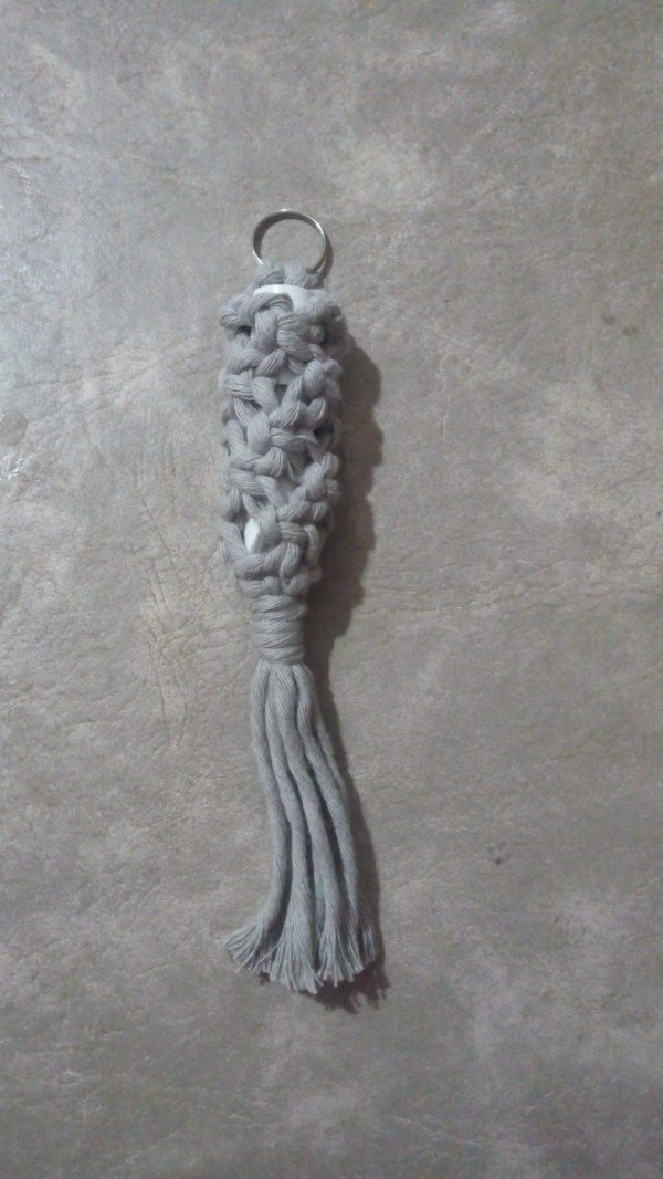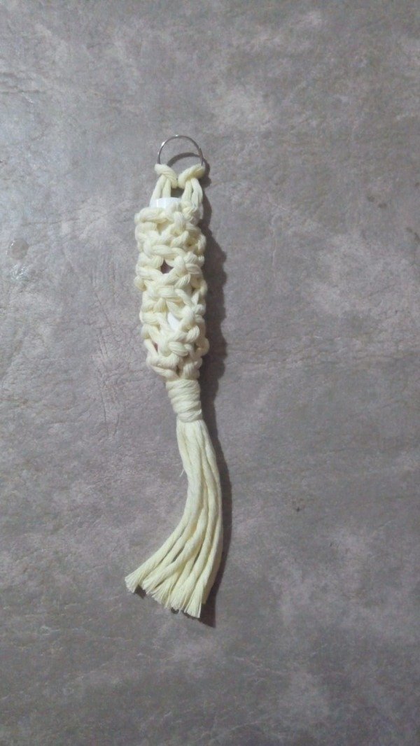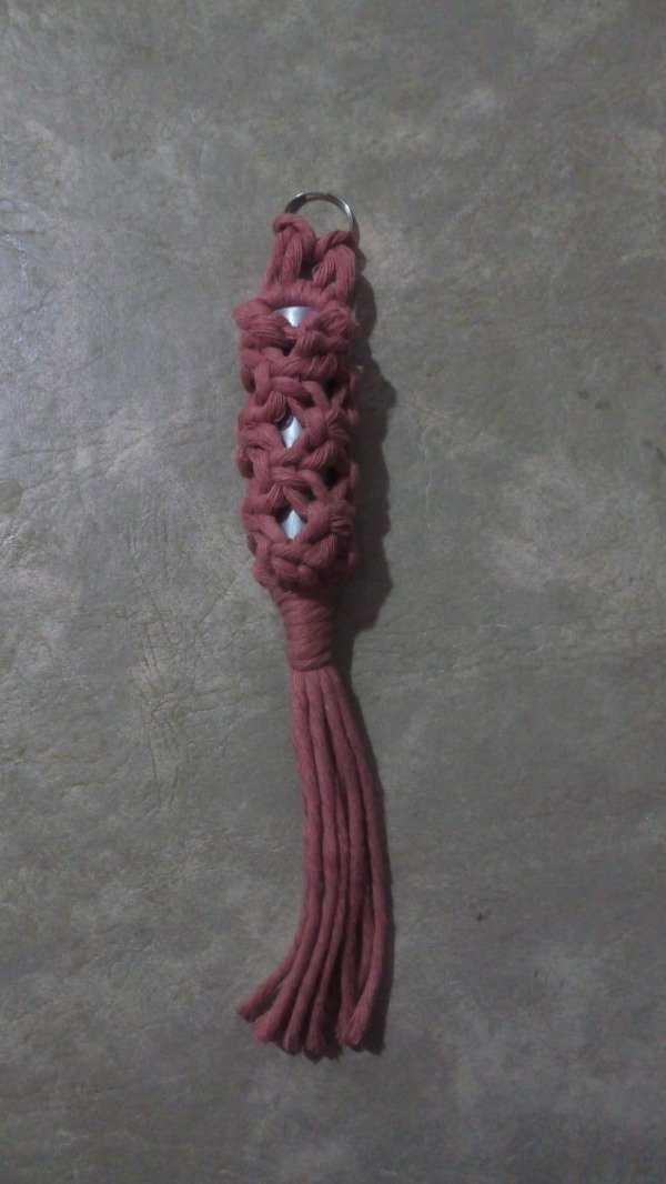 Este porta labial está realizado completamente a mano en macramé, ideal para llevar tu labial siempre a mano dentro de la cartera, mochila o colgado del llavero.